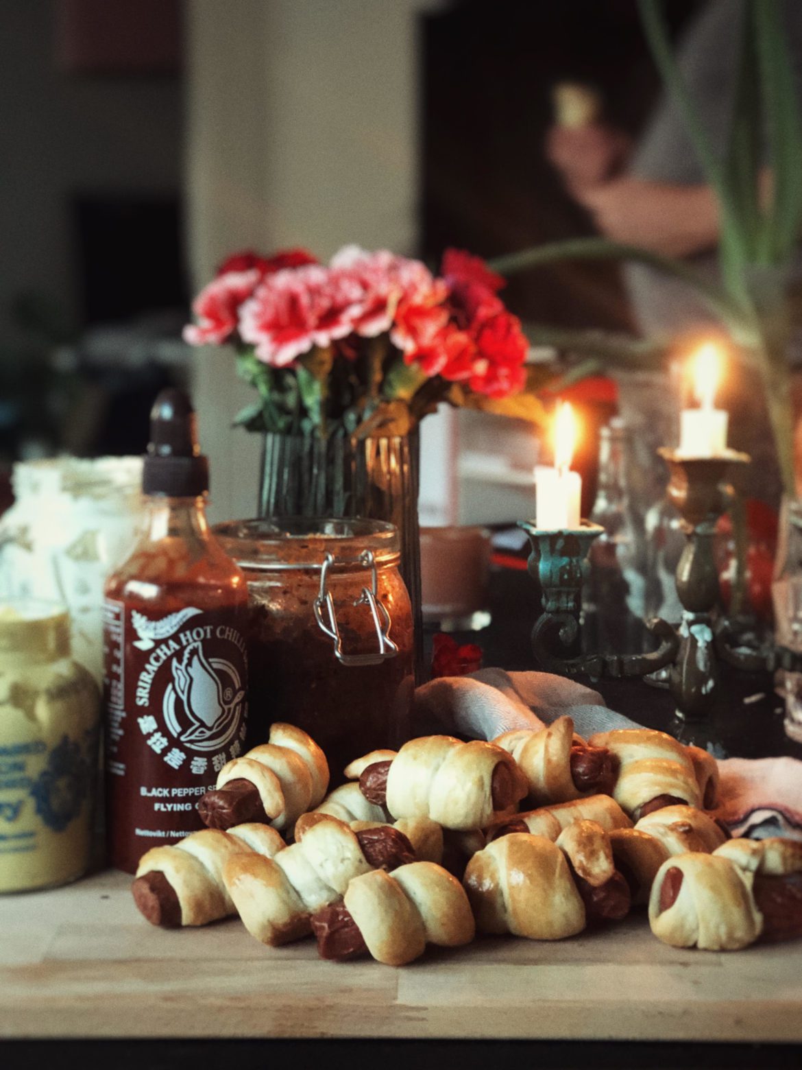 För du tar de korvar du vill… chorizo, thûringerwurst, bratwurst eller små minisalamis och så lindar in dem i till exempel smördeg. Eller som i mitt recept samma deg som jag gjorde när jag gick i scouterna för en herrans massa år sedan. Då gjorde man så kallat pinnbröd och lindade degen runt… ja en pinne och gräddade över öppen eld. Nu lindar jag istället samma deg runt korvarna, penslar dem lätt och gräddar dem sedan i ugnen. Det blir en godbit som funkar bra till mellanmål eller drinktilltugg. Prova och doppa dem i majonäs, chilisås, chimichurri eller någon annan god sås vetja det är gott!