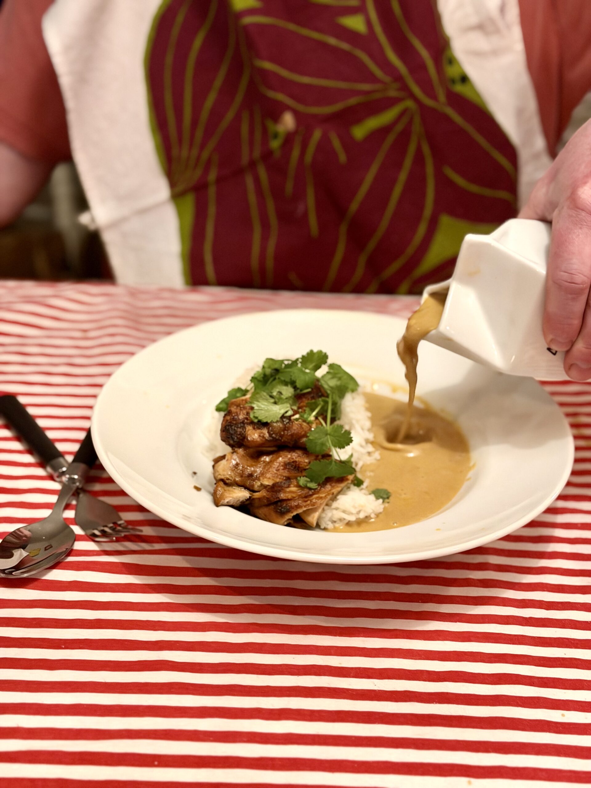 Häromdagen satt R vid bordet och hällde en rykande het kokosbuljong runt ett perfekt format risberg. Det var varmt för hans fingrar eftersom jag tvingade honom att hälla långsamt. Jag ville ha den perfekta bilden där den smarriga såsen, mötte riset och satt redo med kameran. Ni ser hur gott det ser ut när såsen möter riset, tänk sedan att du får en tugga av det där. Japp! Jag kan säga att det var lika hett som gott!